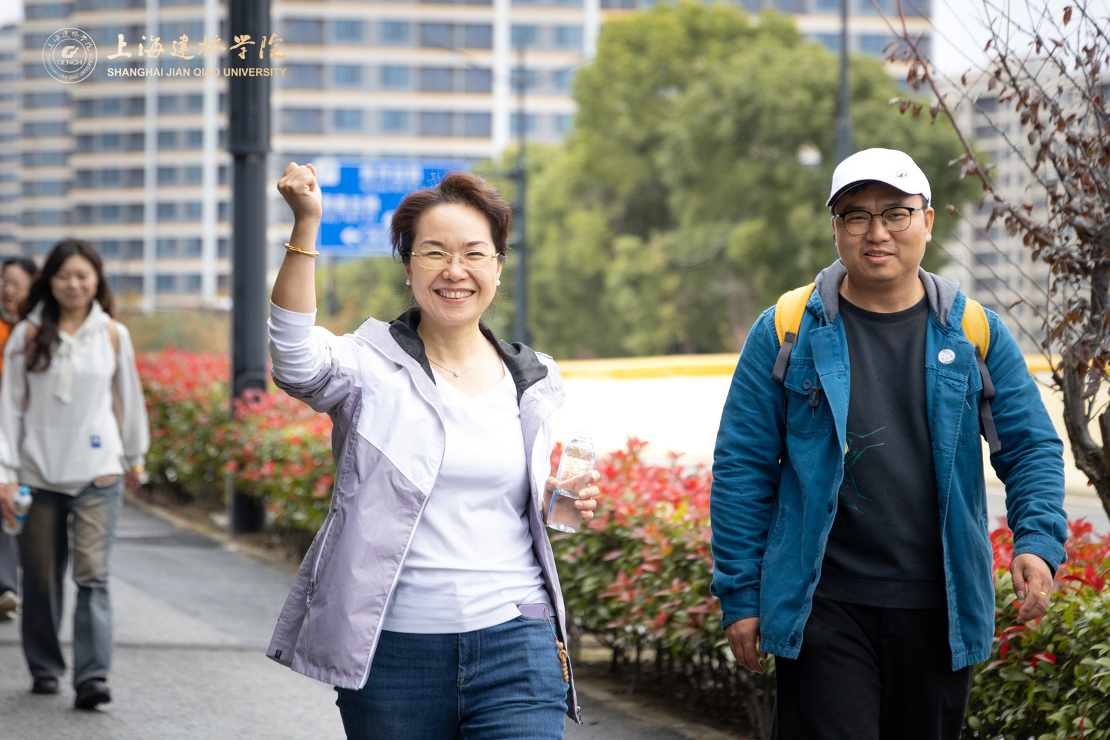 在健步走热身环节,体育部赵龙龙老师带领全体参与者进行了八段锦热身。参赛选手们按分工会为组别依次出发,穿着印有“上海建桥学院”标识的橙色马甲,穿梭于秋色斑斓的树荫大道,形成一道流动的风景线。队伍沿途经橄榄路、沪城环路、海港大道,海基六路,见证海洋大学、海事大学、海立方、信息飞鱼园区、智能网联汽车综合测试示范区等临港现代化地标,全程6.3公里。道路两侧层林尽染,树叶在秋风中沙沙作响,与教职工们的欢声笑语交织成一曲动人的秋日交响。